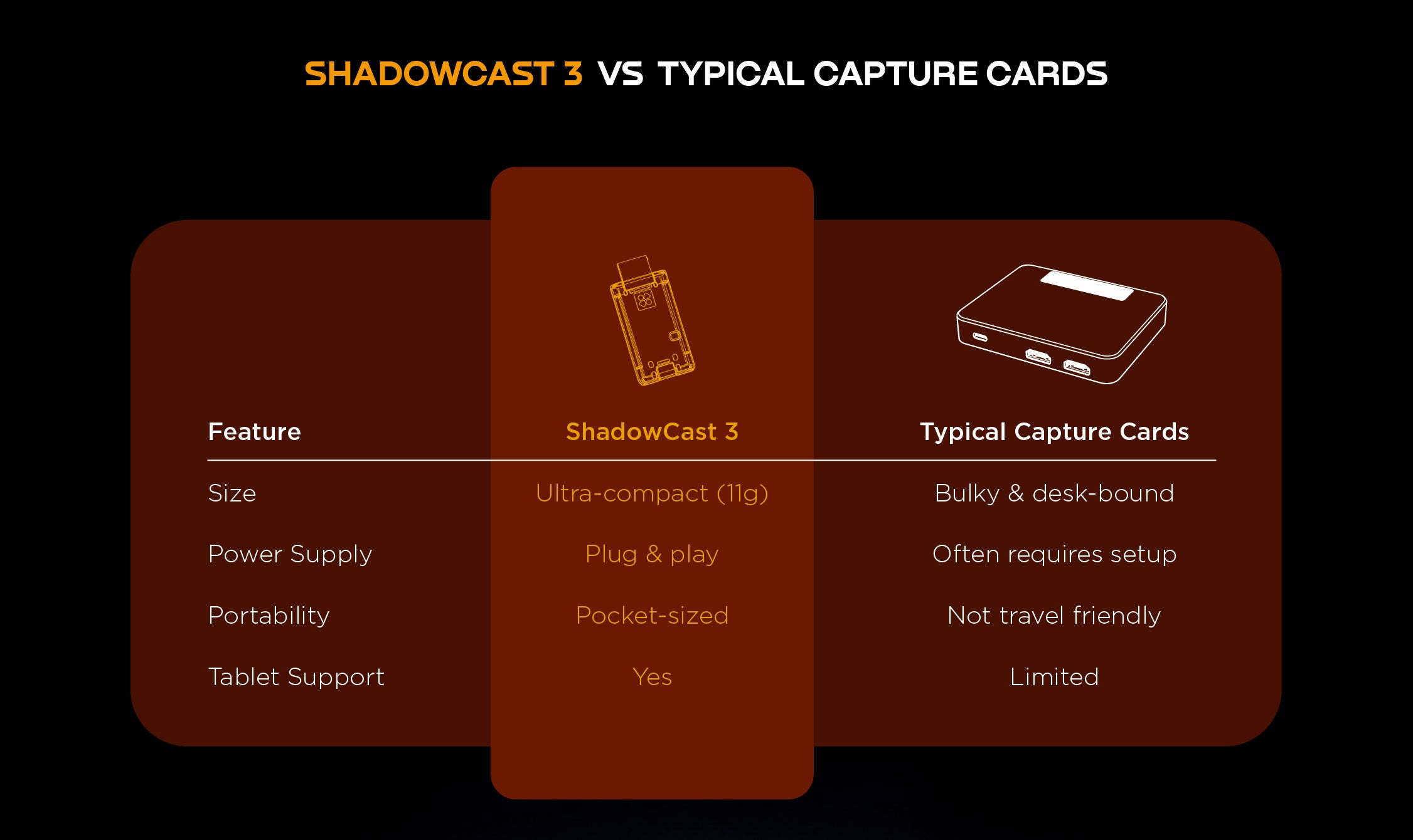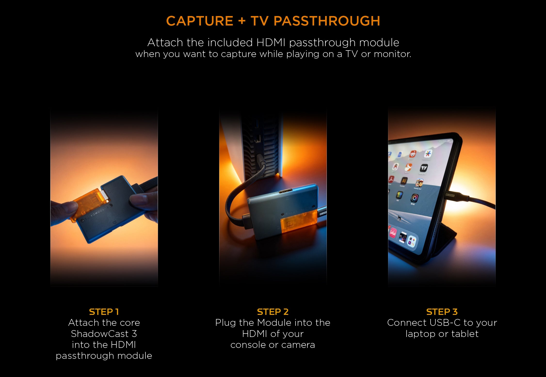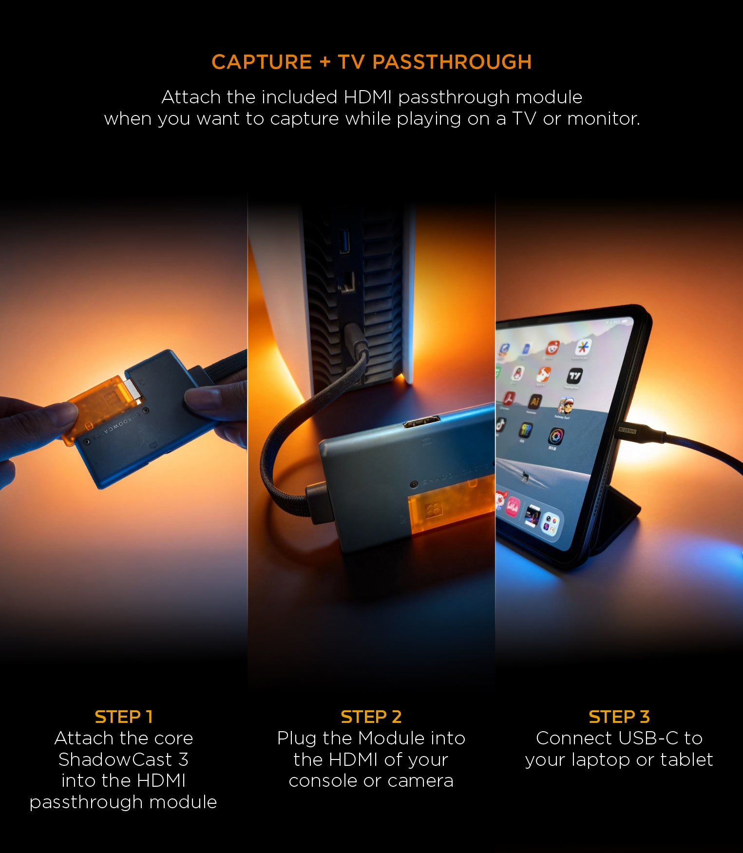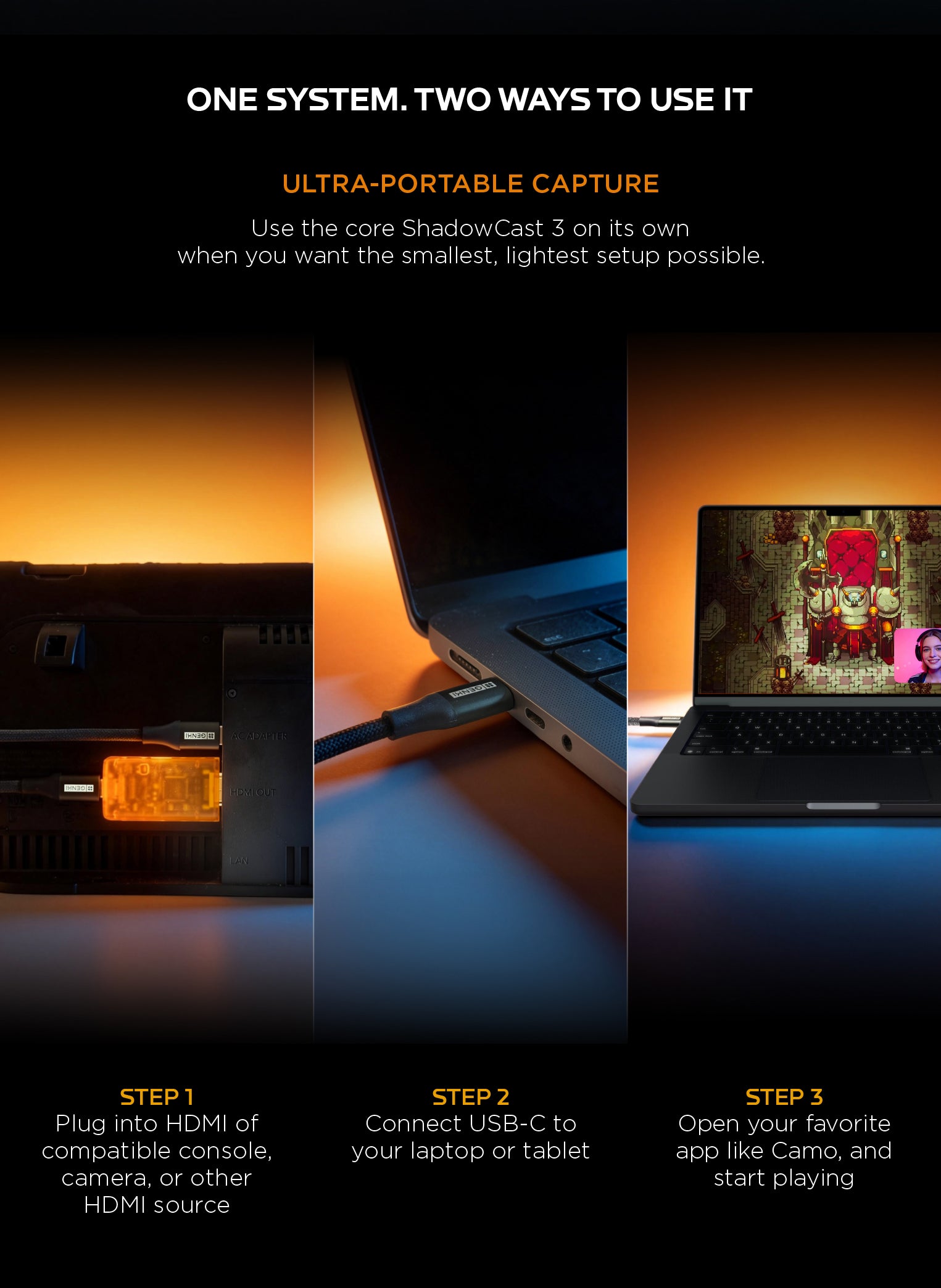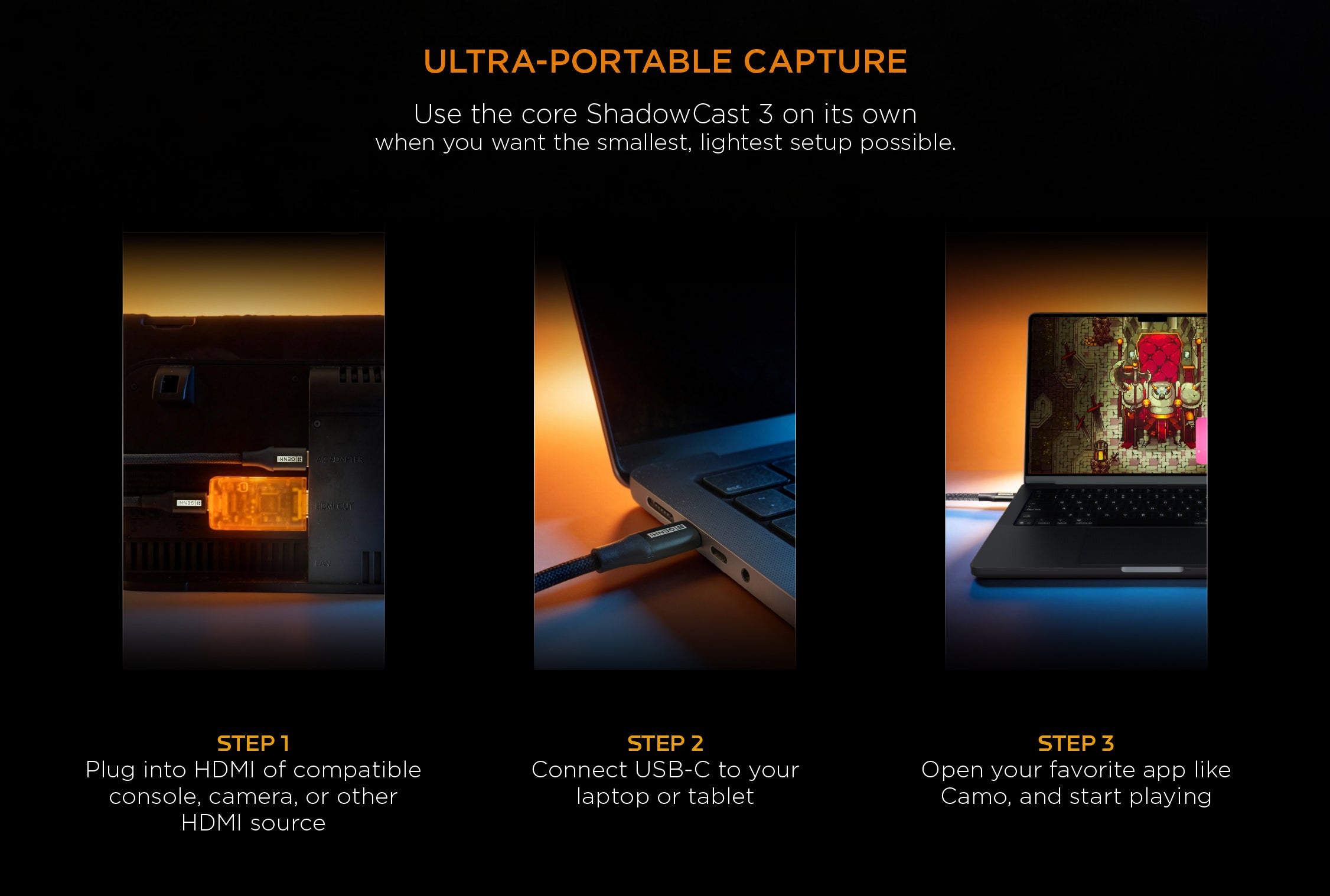 ShadowCast 3 is the world’s smallest 4K60 capture card. Turn your laptop or iPad into a portable gaming display and build the ultimate travel gaming setup.